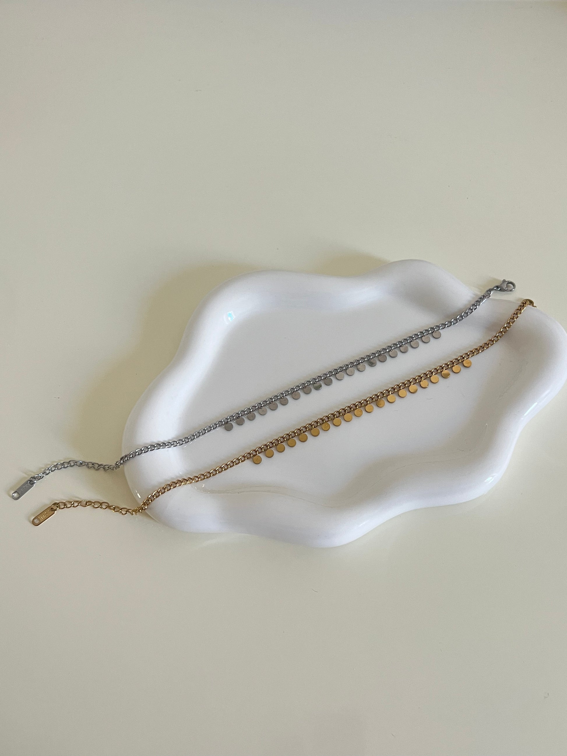 La Cavigliera India è l'accessorio perfetto per completare il tuo stile. Realizzata in acciaio inossidabile, è resistente e di alta qualità. I suoi pendenti a forma di cerchio che decorano tutta la catenina, aggiungono un tocco di eleganza e originalità al tuo look. Mostra la tua personalità unica con questa cavigliera dal design unico.